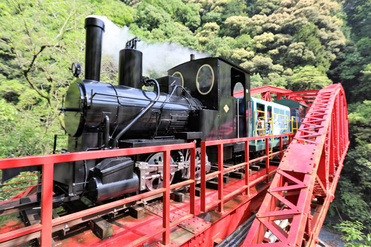【礦山観光列車】礦山主題公園內,帶遊客穿越山谷隧道,抵達礦坑入口欣賞礦山歷史風貌。 這輛復古小火車從「開運站」出發,車程約五分鐘,沿途風景優美,經過紅色的溪谷鐵橋後抵達「幸運站」,遊客可在此進入坑道參觀,體驗別子銅山過去的採礦歷史與生活。